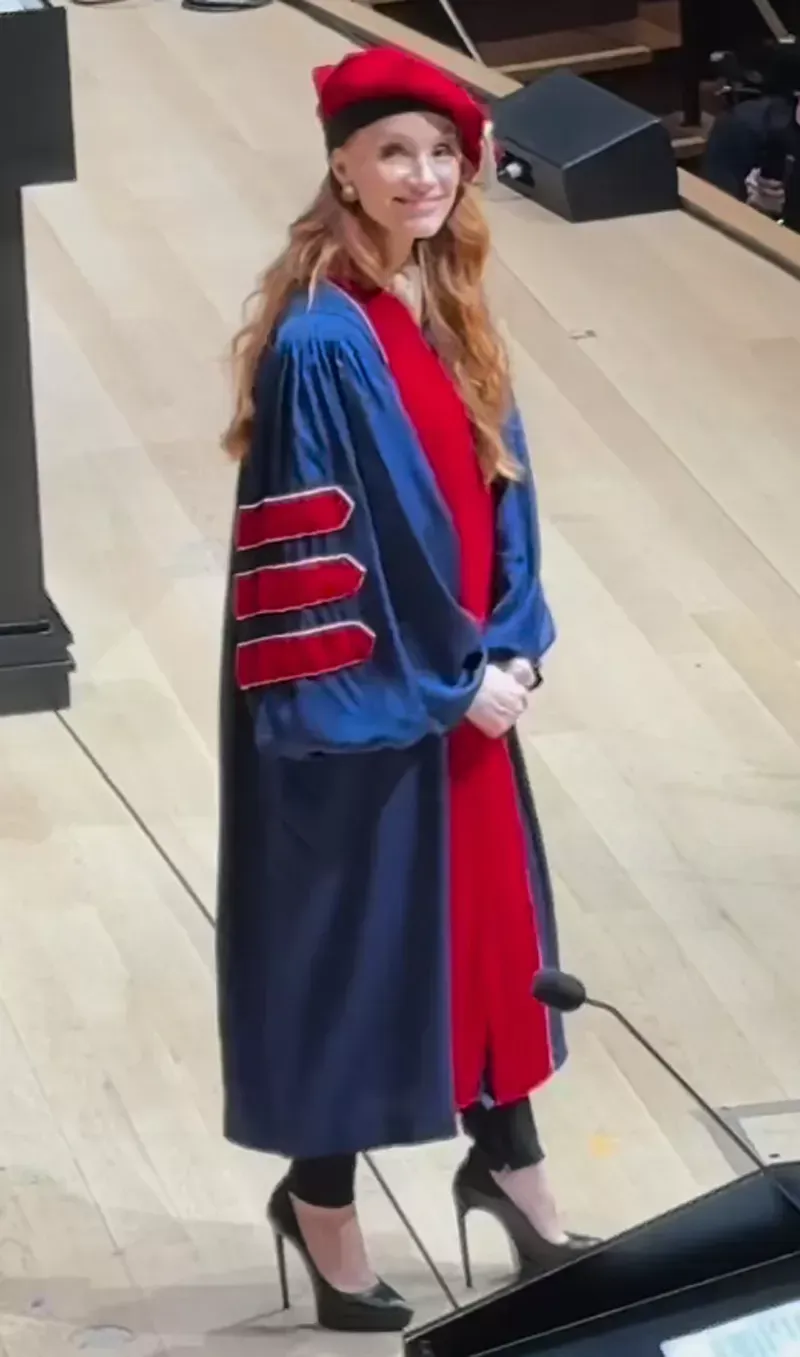 Após filmar a entrada do edifício Irene Diamond da universidade e exibir seu ingresso para a cerimônia, Chastain foi vista vestindo sua beca e capelo — embora tenha brincado dizendo que sua cabeça era grande demais para o chapéu de doutorado.