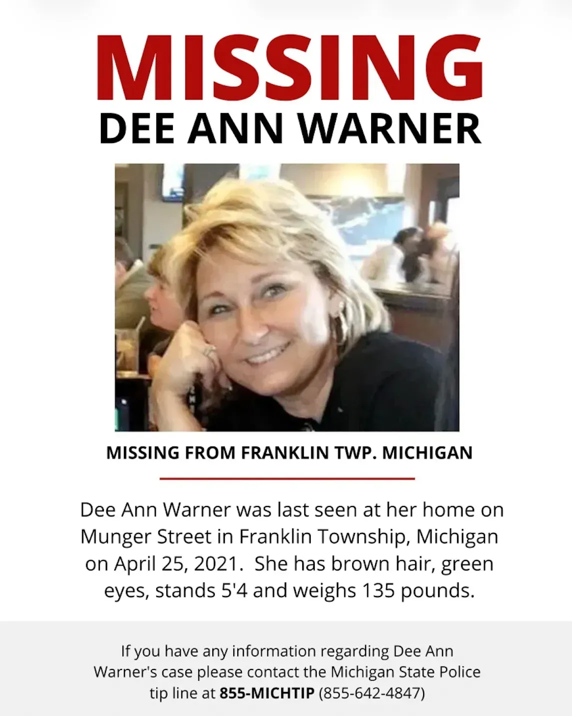 Infelizmente, essa seria a última vez que Parker a veria viva: dois dias depois, Dee Warner desapareceu sem deixar rastro. Sua filha do primeiro casamento, Rikkell Bock, foi a primeira a dar o alarme quando chegou à casa da mãe para o tradicional café da manhã de domingo e não encontrou Dee. Seu Hummer e seu Cadillac Escalade ainda estavam estacionados na propriedade, mas uma mala de viagem — junto com um modelador de cachos, uma nécessaire, seu celular e sua bolsa — havia sumido.