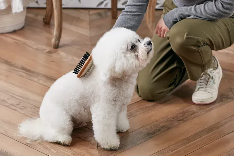 Imagem ilustrativa de uma mulher cuidando da higiene de um cachorro.