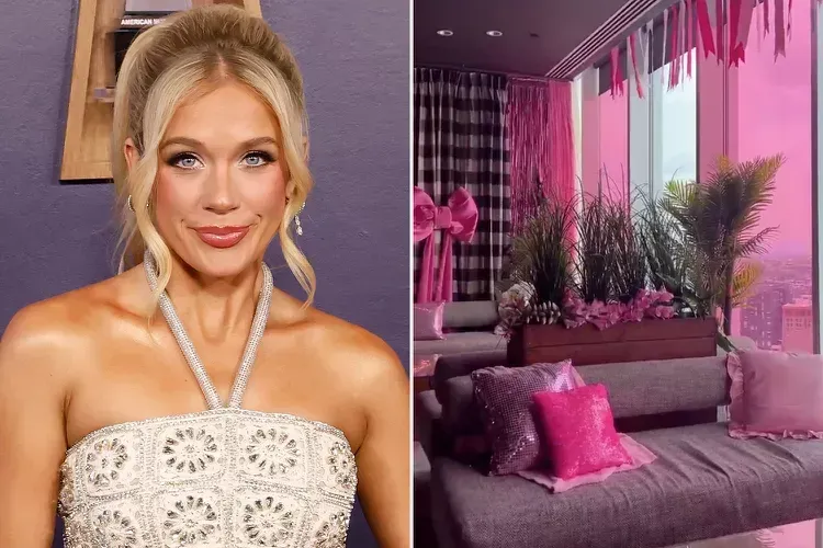 O bar no alto do prédio foi decorado com o glamour característico de Moroney, com enormes laços rosa enfeitando as paredes, fitas rosa-choque penduradas no teto e strass adornando todos os ângulos possíveis do espaço.